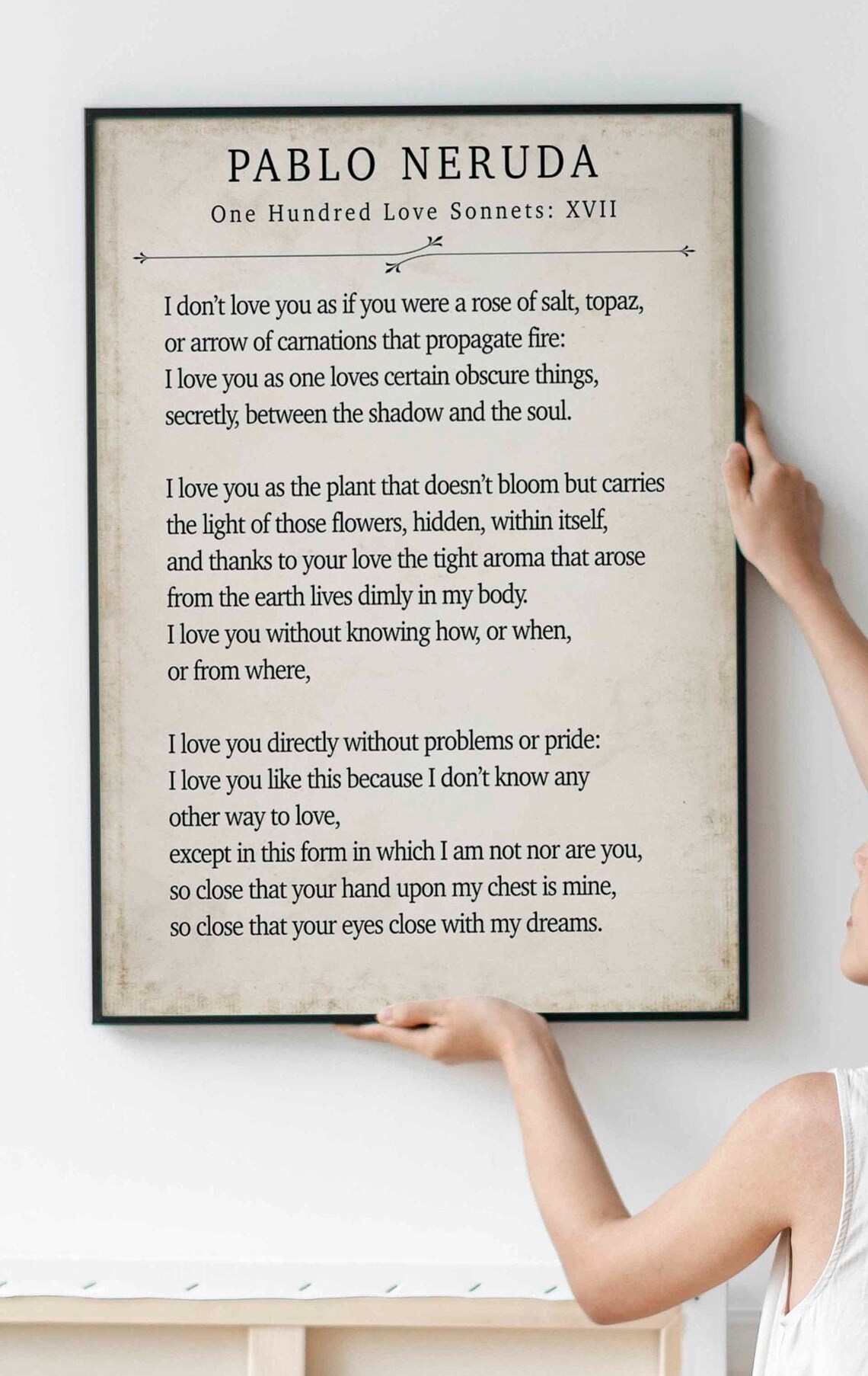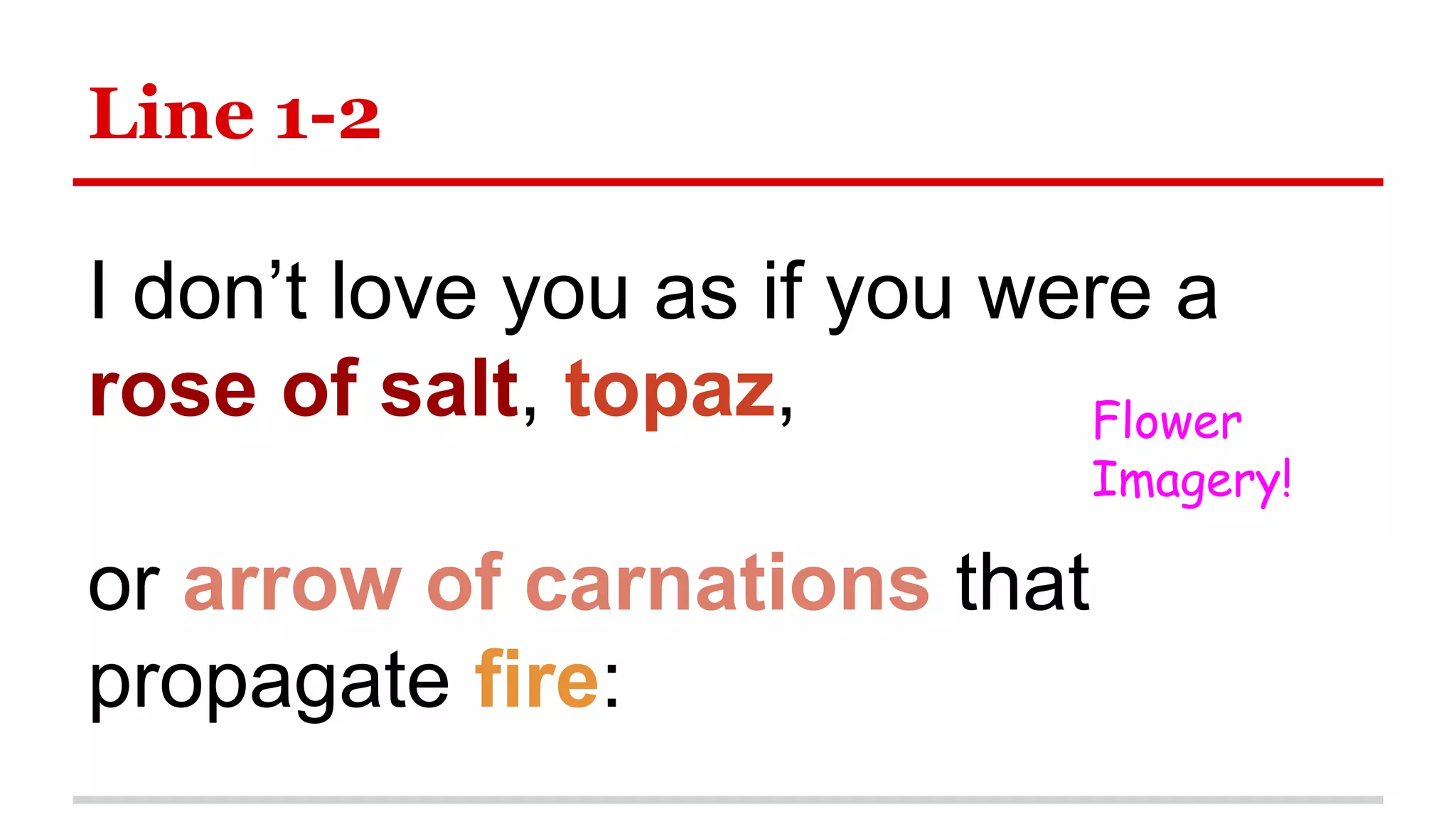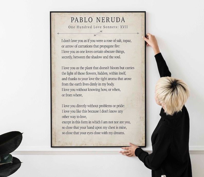 I love you as the plant that never blooms but carries in itself the light of hidden flowers; thanks to your love a certain solid fragrance, risen from the earth, lives darkly in my body. I do not love you as if you were a salt rose, or topaz or the arrow of carnations the fire shoots off 'I do not love you' by Pablo Neruda, also known as Sonnet 17, is a fourteen-line poem that takes the form of a Petrarchan sonnet